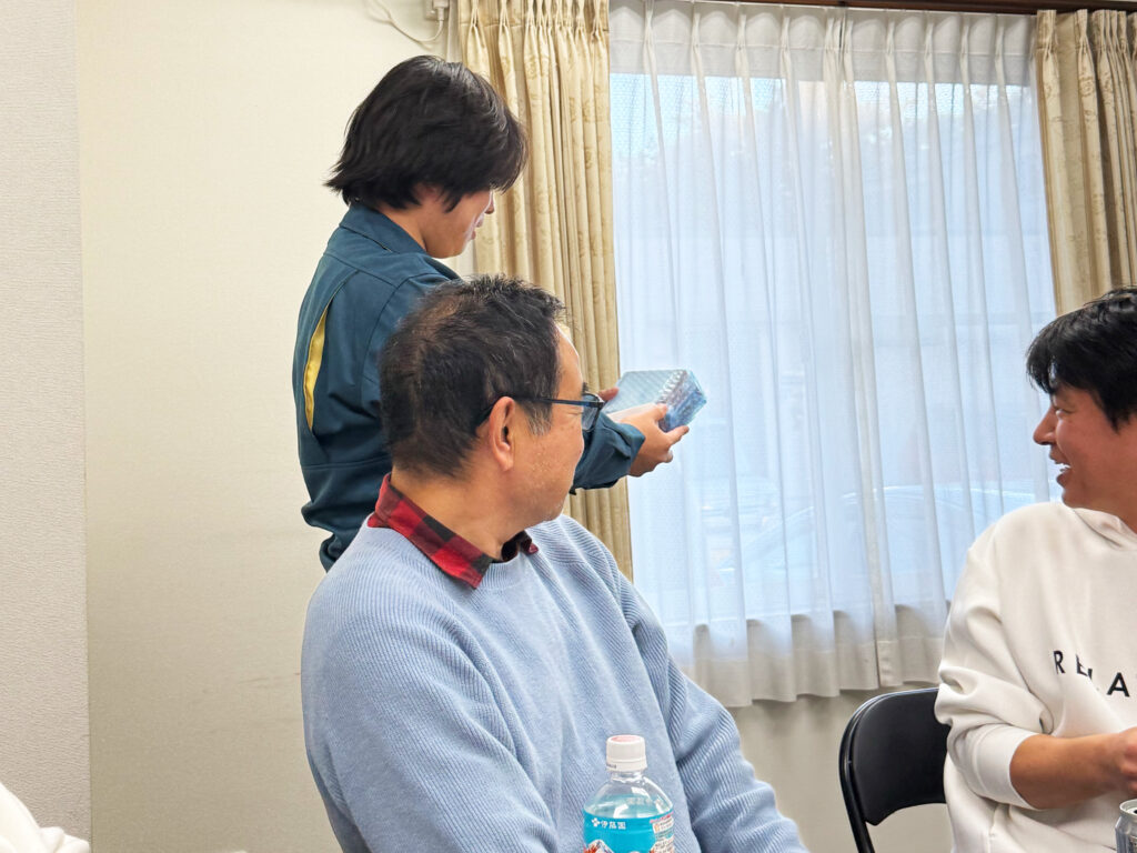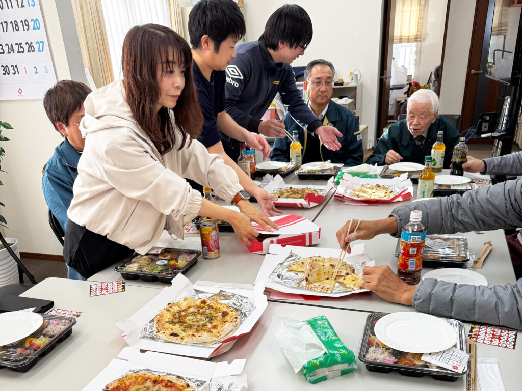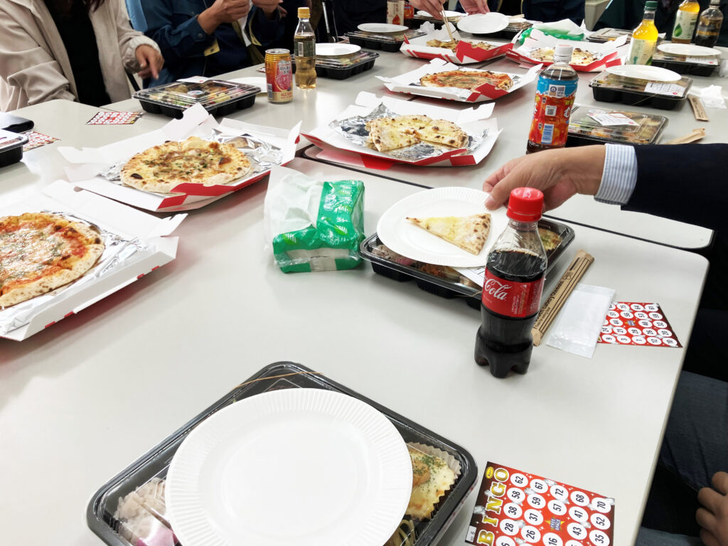 ピザとお弁当を頂きながらお話をして、ビンゴゲームやじゃんけん大会で盛り上がりました。